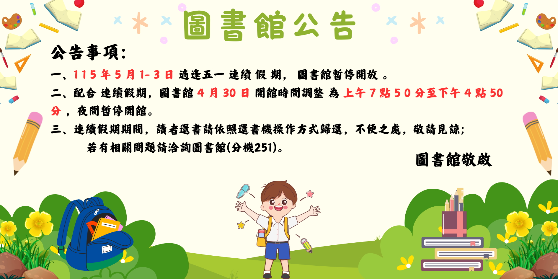 > 【公告】115年五一假期閉館公告